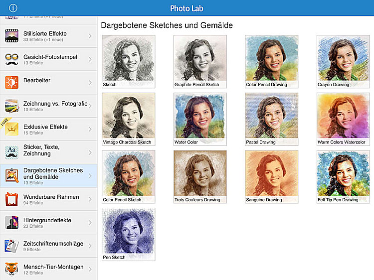 Falsch machen kann man bei Photo Lab Pro nichts. Denn die Foto-App macht alles automatisch und das auch ziemlich gut. Einige hundert Effekte bringt das Programm mit. Wer sich da schwer tut, der findet bei den beliebtesten Effekten, die in einer eigenen Rubrik zusammengefasst sind, etwas Populäres. Das schon angesprochene Tiger-Gesicht gibt es oder beispielsweise eine Doppelbelichtung mit Schmetterlingen. Eine kleine Sammlung von Titelseiten bekannter Zeitschriften darf natürlich ebenso wenig fehlen und auch Streetart, womit man Porträts individualisiert.