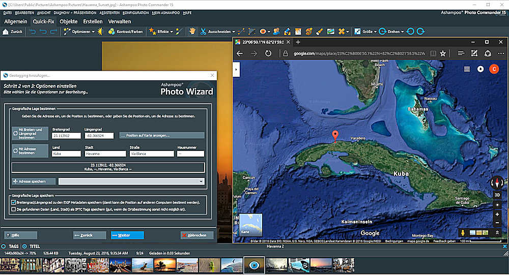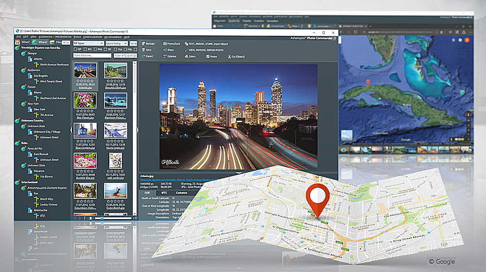 Mit Geotagging können moderne Kameras und Handys festhalten, wo ein Bild aufgenommen wurde. Der neue Ashampoo Photo Commander 15 kann diese Daten nicht nur verarbeiten, sondern verwandelt blosse Längen- und Breitengraden in Länder, Städte und Strassen! Egal, ob sie von einer Reise, Familienfeier oder aus dem Beruf stammen – Ihre Bilder bekommen eine ganz neue Ordnung.