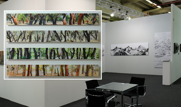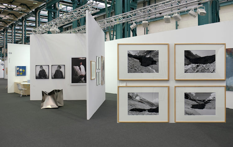 Am Stand der Galerie von Braunbehrens, Stuttgart, sind unter anderem Diasec-Prints von Georg Küttinger zu sehen. Küttinger fotografiert beispielsweise Schweizer Alpenlandschaften, dann aber auch Lagunen und Baumgruppen die aus Teilen einer realen Landschaft, fotografiert zu abweichenden Zeiten, aus unterschiedlichen Blickwinkeln, zu synthetischen Raumkonstruktionen zusammengesetzt sind.