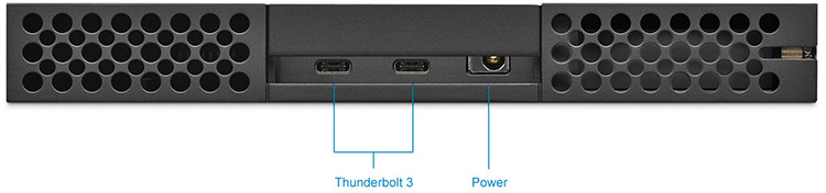 Zwei Thunderbolt-3-Anschlüsse erlauben die Verkettung mehrerer Geräte (Daisy Chain). Die Stromversorgung kann ebenfalls über Thunderbolt erfolgen. Dabei lässt sich auch ein Notebook-Akku (z.B. der eines 2016er MacBook Pro) aufladen. Der für Thunderbolt 3 genutzte USB-C-Anschluss sorgt künftig für grössere Kompatibilität, wobei mit normalen USB 3.1-Kabeln nicht dasselbe Tempo erreicht wird.