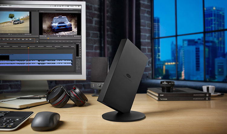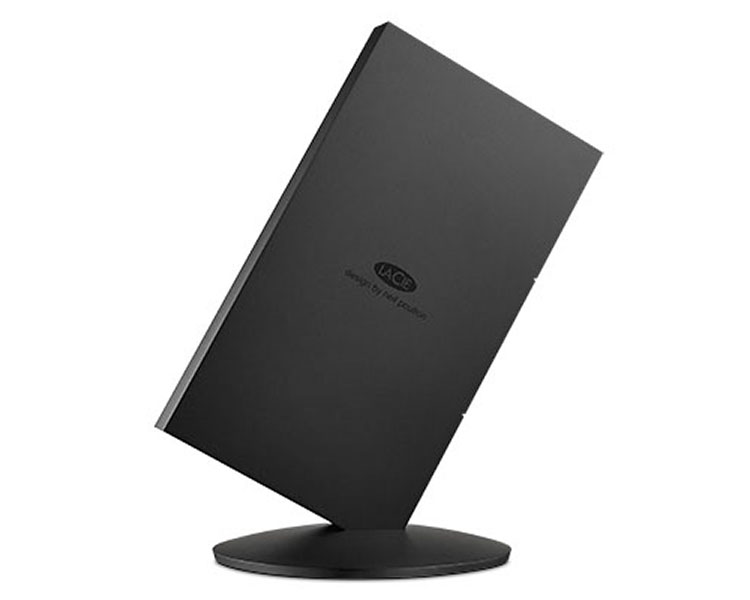 Die LaCie Bolt3 im Ständer: In der Bolt3 werkeln zwei schnelle SSDs, die zusammen 2 TB an Speicherplatz bieten. Dank der Schnittstelle Thunderbolt 3 sind superschenelle Datentransfers möglich.