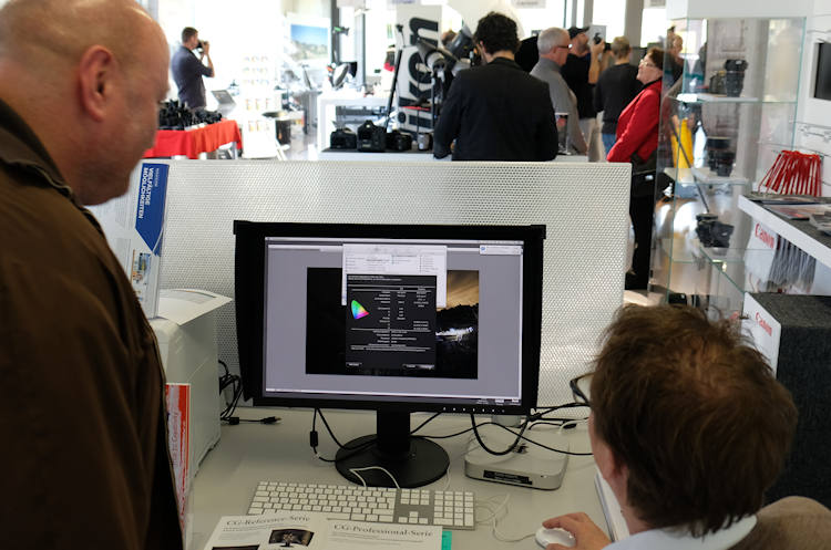 Bei Eizo wird der neueste Grafik-Bildschirm gezeigt. Oliver May erklärt, wie einfcah das Kalibrieren geht – damit die Farben so sieht, wie sie danach auf dem Print erscheinen.