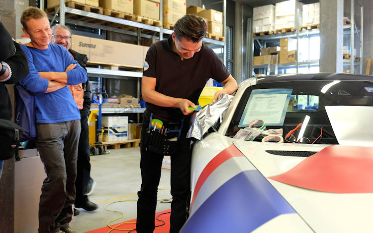 Ein Kernbereich von Profoil ist das uferlose Sortiment von Klebefolien, das vor allem in der Fahrzeugbeschriftung Anwendung findet. An einem Kurzseminar zeigt Verklebespezialist Robin Bös, wie man auch knifflige Flächen fachgerecht überzieht