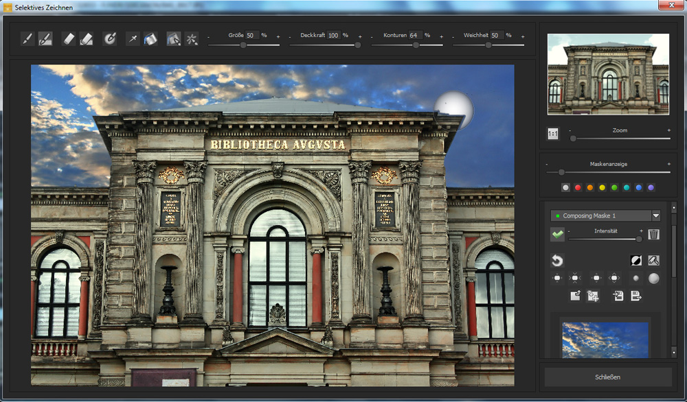 In der selektiven Detailbearbeitungen für eine Optimierung einzelner Bereiche im Bild lassen sich pixelgenau Kontraste erhöhen/reduzieren, Masken aus Helligkeit/Farbe per Pipette wählen, Masken weichzeichnen, Reduzieren, Erweitern sowie automatisch an die Verzeichnungskorrektur im RAW-Modul auch nachträglich anpassen.