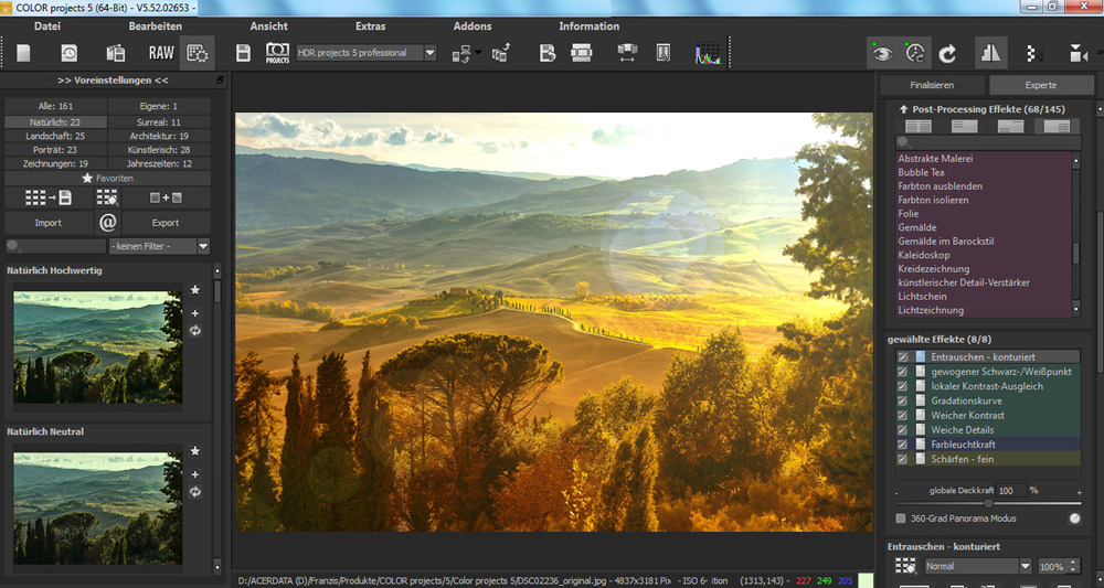 Neu sind 18 zusätzliche Post-Processing Effekte wie Auflösen, Dunst und Nebel reduzieren, Entrauschen, Optimieren, Farbdynamik, analoges Filmkorn, fraktales Filmkorn, logarithmische Gradation, Schärfe Optimieren, Spitzlichter restaurieren, Struktur optimieren, logarithmische Farbkanal-Gradation, Farbton korrigieren, Warp, Lichtschein, Linsenreflexion und Wasser-Spiegelung vervollständigen das Bearbeitungsspektrum für jeglichen individuellen Bildausdruck.