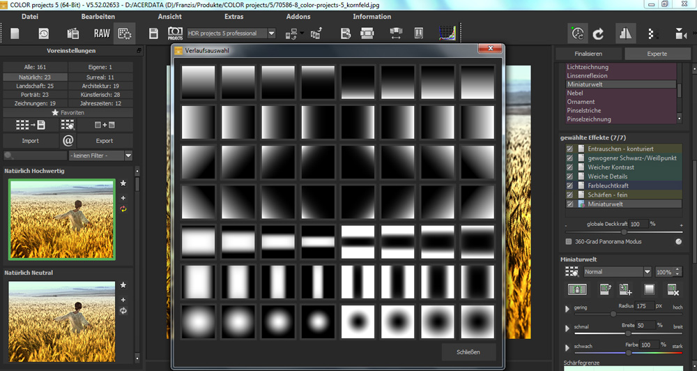 Das neue Gradienten Modul (56 Verlaufsmasken) ermöglicht den Verlauf von Post-Processing Effekten im Bild so zu beeinflussen, um den Fokus auf bestimmte Motivelemente zu lenken, Teilbereiche im Bild auszublenden oder den Gesamteindruck des Bildes zu variieren.