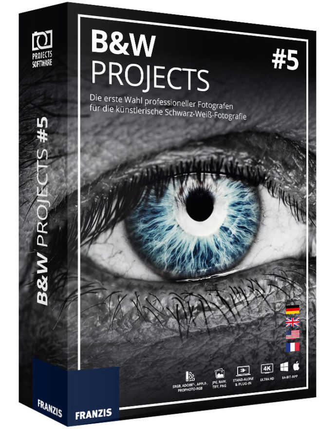 Für Fans von Schweissfotos hat Franzis die fünfte Version des Mac- und Windows-Programms «Black & White projects» veröffentlicht, das einst als «Silver Projects professional» gestartet war und seit Version 3 als «Black & White projects» bekannt ist.