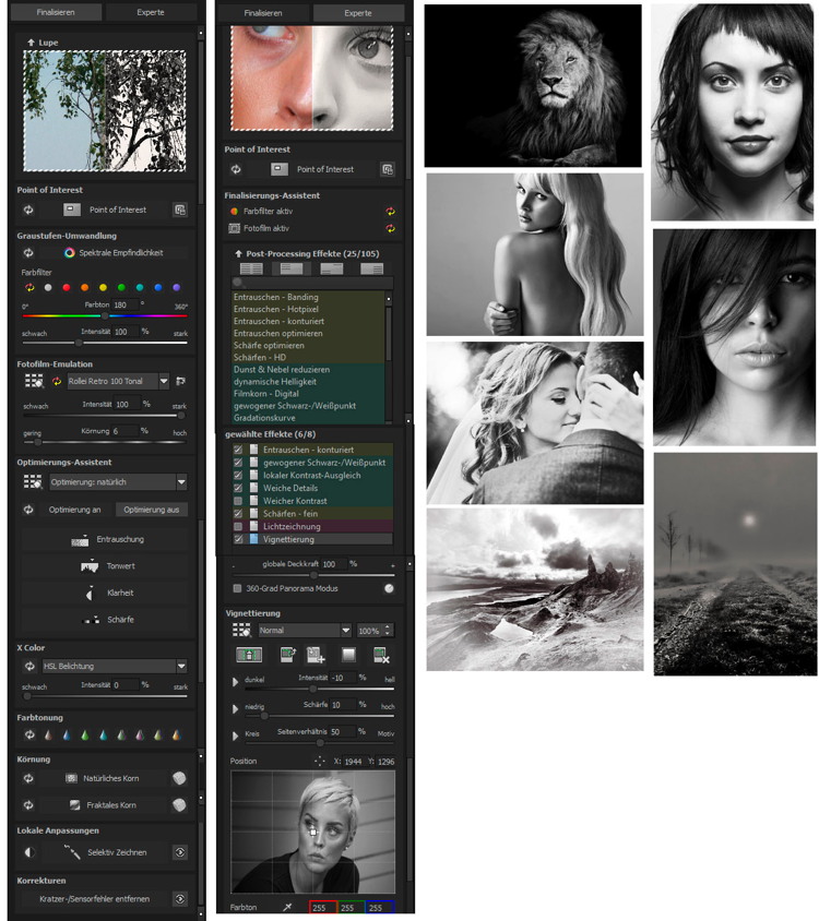 Screenshots (links) von Bearbeitungspaletten in Black & White projects 5 und Bildbeispiele