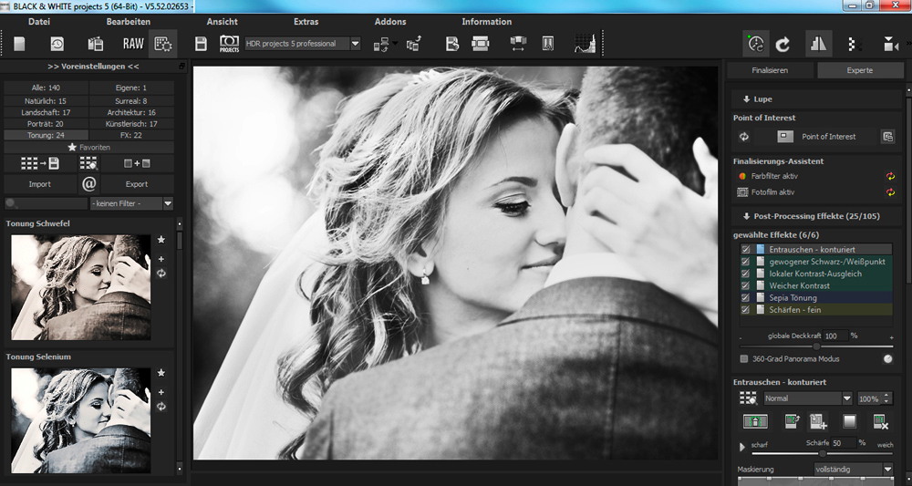 Black & White projects 5 mit neuer Benutzeroberfläche erlaubt wie bisher die detaillierte Tonwertumwandlung und bietet kreative Bearbeitungstools für ausdruckstarke Monochrombilder.