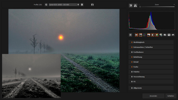 Das Raw-Modul unterstützt nun bis zu 900 Raw-Kameraformate und erlaubt mit der zusätzlichen neuen automatischen Brillanz-Optimierung und Funktionen wie Lichtbeugungskorrektur, dynamische Helligkeit, Trapez-Entzerrung und Farbdynamik eine komplette Raw-Datenentwicklung. Der Umweg über eine externe Raw-Entwicklung ist damit nicht nötig.