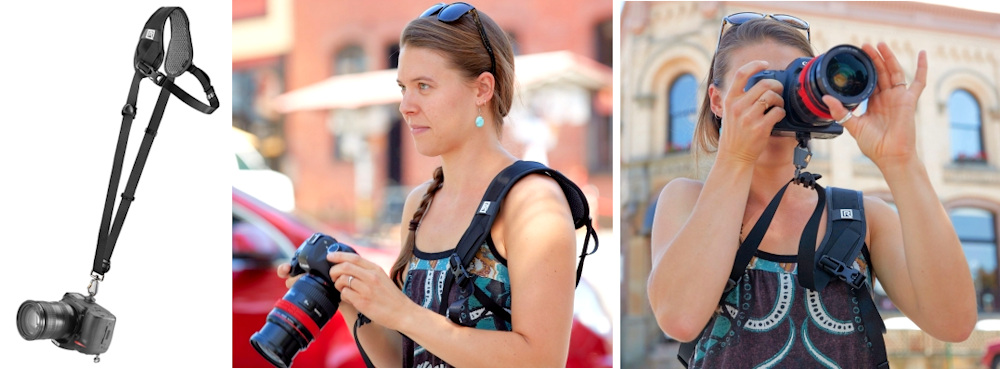 Blitzartiger Kamerazugriff und sicheres Tragen – darauf kommt es bei schnellen Aufnahmen und Reportagen an. Der BlackRapid Curve Breathe ist mit seiner ergonomischen Form besonders komfortabel und tragsicher und erweist sich auch bei hohen Temperaturen und längeren Einsatz als sehr angenehm. Die Kamera liegt eng am Körper an und kann blitzschnell zur Hand genommen werden.