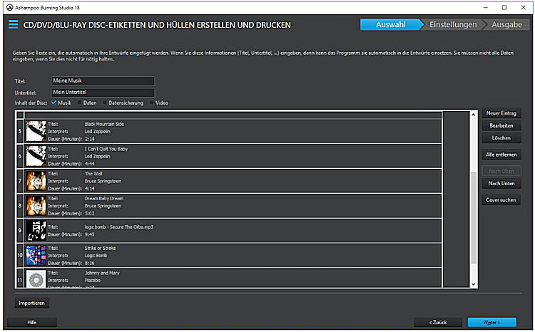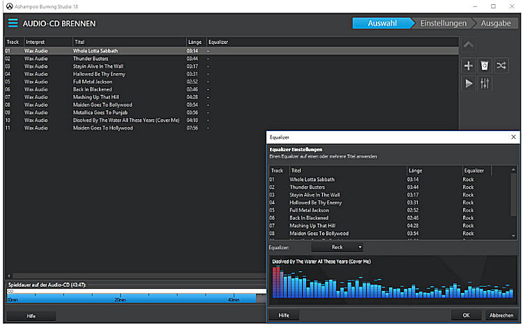 Bei Musik-Dateien ist das Burning Studio in seinem Element. Rippen Sie CDs und speichern sie in bester Qualität oder besonders platzsparend. Interpret und Titel werden dabei automatisch erkannt. CDs brennen Sie dann komfortabel, optional auch mit Equalizer oder Lautstärkeanpassung für verbesserten Sound, bevor ein passendes Cover in Druck geht.