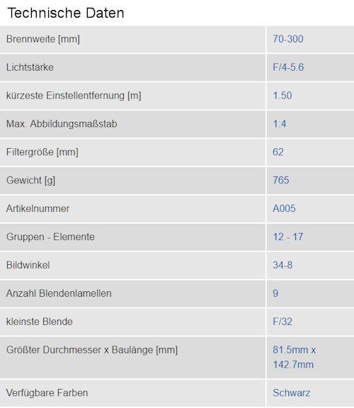 An Kameras mit Vollformatsensoren beträgt die Brennweite des Hochleistungs-Telezooms 70mm bis 300mm, während sich an Kameras mit APS-C Sensoren eine rechnerische Brennweite von 109mm bis 465mm (bezogen auf den Bildwinkel des Vollformats) ergibt.