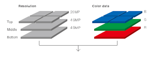 Ein konventioneller Farbsensor nimmt die Auflösungsinformationen über die grünen Megapixel auf, was bedeutet, dass diese Informationen auf gerade mal 50% aller Pixel basieren. Der neue Quattro Sensor hingegen fängt die Auflösungsinformation mit seiner gesamten oberen Schicht ein. Er hält doppelt so viele Informationen über die Auflösung fest, wie ein konventioneller Farbsensor. Die auf den 19,6 Megapixeln der oberen Schicht basierenden Auflösungsinformationen sind äquivalent zu einer konventionellen 39 Megapixel hohen Auflösung.