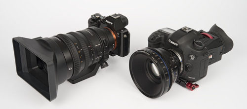 Spezielle Objektive zum Filmen erleichtern das Arbeiten. Links ein 28-135mm-PowerZoom von Sony an einer Alpha 7s und rechts ein 85mm-Cine-Objektiv von Zeiss an einer Canon EOS 5D Mark III. (Das Sony ist kein richtiges Cine-Objektiv, aber fürs Videofilmen mit Foto- und Videokameras konzipiert.)