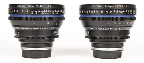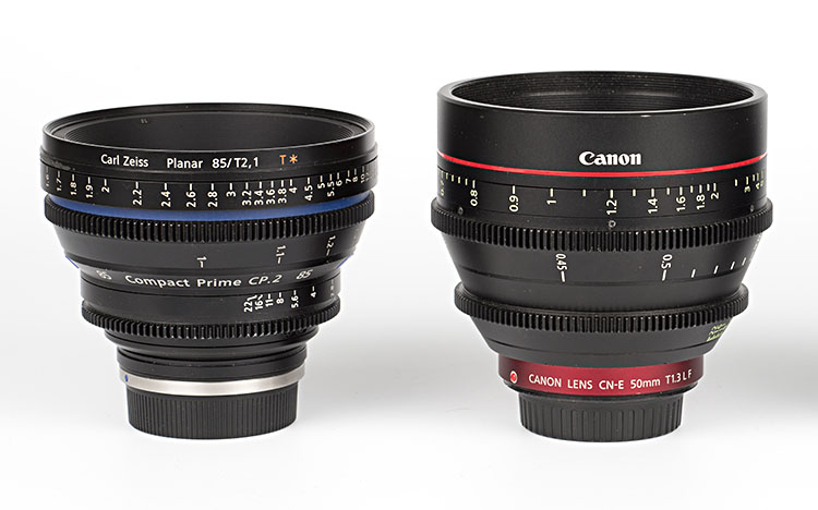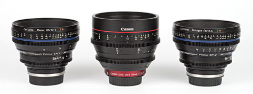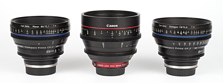 Cine-Objektive von Zeiss (CP.2-Reihe) flankieren eines von Canon (EOS Cinema EF). Zeiss bietet seit langer Zeit Objektive für Cinematographie an, wobei die CP.2-Festbrennweiten die günstigsten sind. Wechselobjektive produzierte Canon lange nur für ihre Camcorder im TV/ENG-Bereich, hat mit dem Start des EOS Cinema-Systems im Herbst 2011 auch Cine-Objektive lanciert.