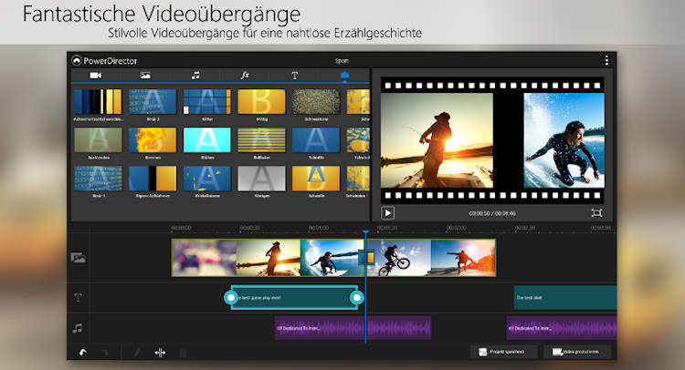 PowerDirector ist in neun Sprachen im Google Play Store erhältlich. PowerDirector ist eine kostenlose App mit Premium-Funktionen (inkl. Ultra HD-Videoproduktion), welche per In-App-Einkäufe freigeschaltet werden.