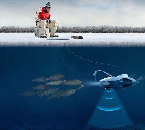 Das obere Bild zeigt die linke Seite des PowerRay, das untere illustriert den Einsatz unter Wasser – hier unter der Eisdecke eines zugeforenen Sees.