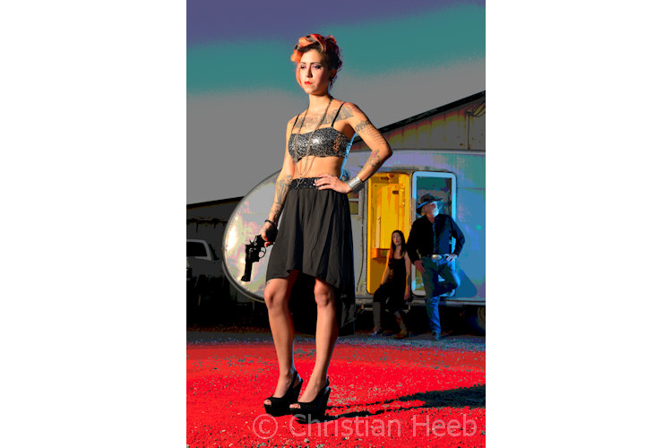American Dreamscapes «Rita and the gun». Das Bild ist bereits ein Klassiker. Ich hatte Rita angesprochen als Sie bei einem Modes Shoot fürs Styling zuständig war. Ich fand Sie interessanter als das Model. Im Hintergrund ist mein Freund der Western Autor Rick Steber und eine Freundin. Den Trailer fand ich zufällig am Rande der Stadt Redmond.