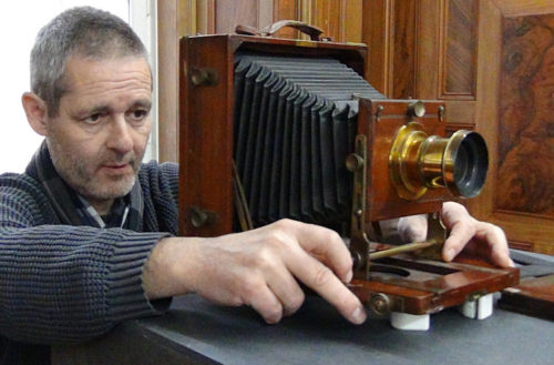 Kurator und Fotohistoriker Markus Schürpf mit der «Hess & Sattler» Laufbodenkamera von Johann Schär (Foto: Monica Boirar)