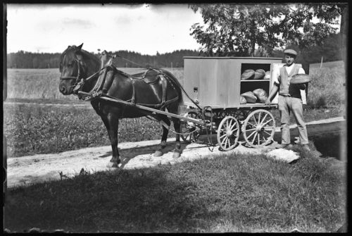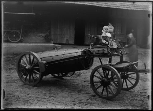 In der inszenierten Fotografie der beiden kleinen Bauernkinder, die auf dem Frontsitz eines Jauchewagens thronen, erscheint ebendieser mehr als elegante, ja gar vornehme Kutsche. Die Bäuerin im Hintergrund, in wohl unbeabsichtigter Bewegungsunschärfe wiedergegeben, erinnert an die Belichtungszeiten von bis zu zwei Sekunden, die Anfang des 20. Jahrhunderts noch gang und gäbe waren.