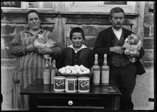 Als eigentliches Highlight und Lieblingsmotiv des Publikums entpuppte sich ein besonders werbewirksames Familienfoto: Ein opulentes Ehepaar posiert mit je einem Huhn im Arm. Mutter und Vater flankieren ihren ebenfalls opulenten, vielleicht 12-jährigen Sohn. Vor ihnen, wohlfeil drapiert, präsentieren sie die zum Verkauf dargebotenen Produkte als weitere Früchte ihrer Anstrengungen: Eier, dazu passender Likör und Honig, allesamt aus Mättenbach in Madiswil.