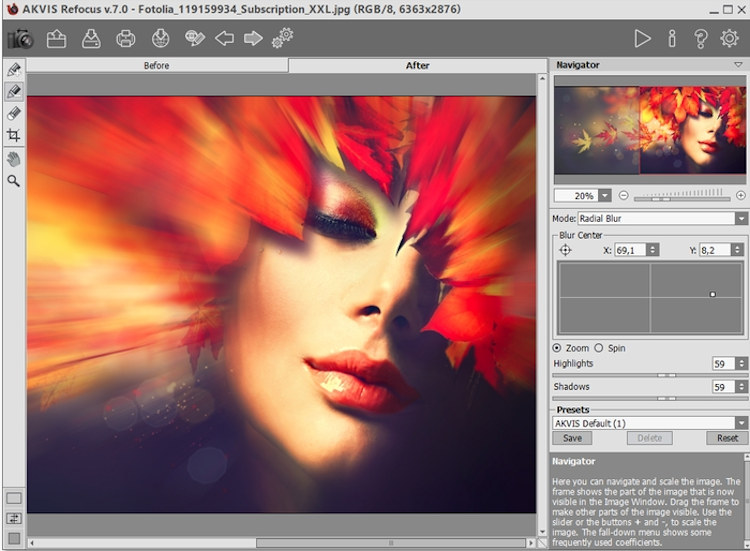 Die Version 7.0 bietet zwei völlig neue Modi: Bewegungsunschärfe und Radiales Weichzeichnen, die erlauben es, natürlich aussehende Bewegungsillusionen – entweder linear für einen vorbeiziehenden Hintergrund oder radial für eine rotierende Bewegung – zu erzeugen. Ausserdem bietet die neue Version den verbesserten Defokus-Effekt und zusätzliche Presets.