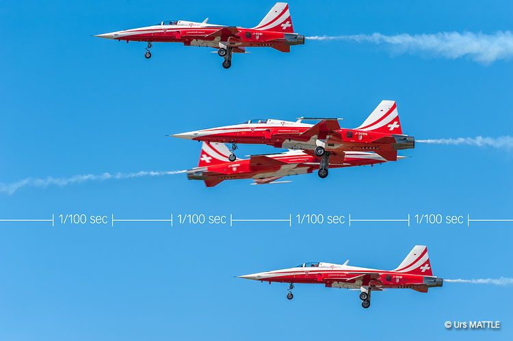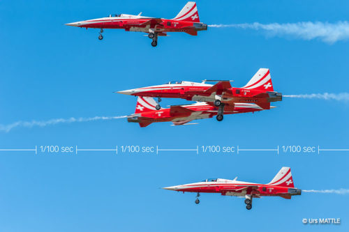 Speed – Beim «Tunnel» kreuzen sich der Patrouille Suisse Verband und der Solist mit fast 1300 km/h (zusammengezählte Geschwindigkeiten), auch die schnellsten Serienaufnahmen zeigen die Flugzeuge selten im entscheidenden Moment. 2010 in Rivolto gelang mir ein Glückstreffer – dort habe ich während der Kreuzung nur ein einziges Mal, intuitiv im richtigen Moment, auf den Auslöser gedrückt.