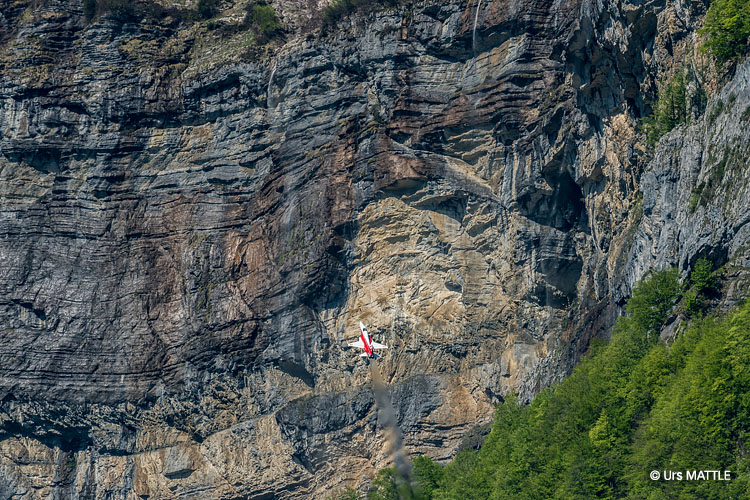 Perspektive – Ein Teleobjektiv verdichtet, macht den Raum flach. Auf dem Foto sieht es dramatischer aus als in Wirklichkeit, der Patrouille Suisse Solist steigt mit genügend Sicherheitsabstand vor der Felswand in Mollis in den Himmel
