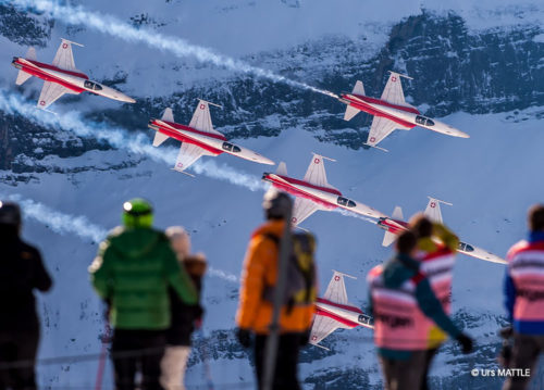 Perspektive – Das Teleobjektiv drückt die Flieger an die Wand, der Effekt wird durch die Zuschauer im Vordergrund verstärkt. Real beträgt der Abstand zum Eiger Gletscher einen Kilometer. Patrouille Suisse und PC-7 Team sind die einzigen Kunstflugteams, welche in schwierigem Gelände ihr Flugprogramm zeigen