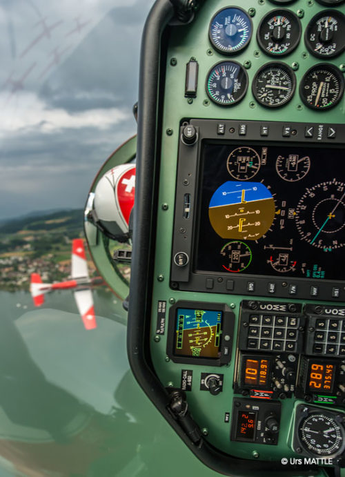 g-Belastung – Bei dieser Kreuzung werden kurzfristig 6 g Beschleunigung erreicht, der g-Messer im Cockpit der PC-7 zeigt bereits den Wert von 4.6 an. Hier kann man nur «auf gut Glück» mit fest abgestützter, blockierter Kamera fotografieren