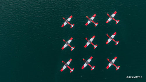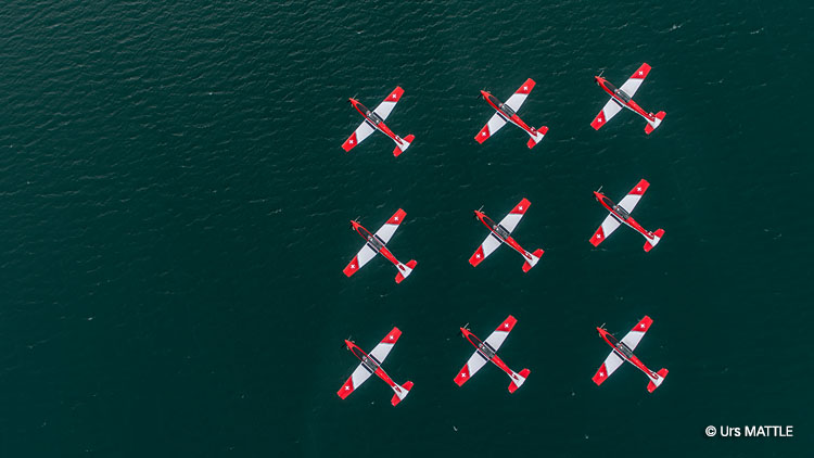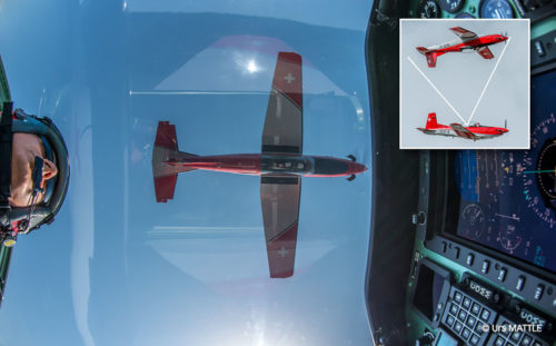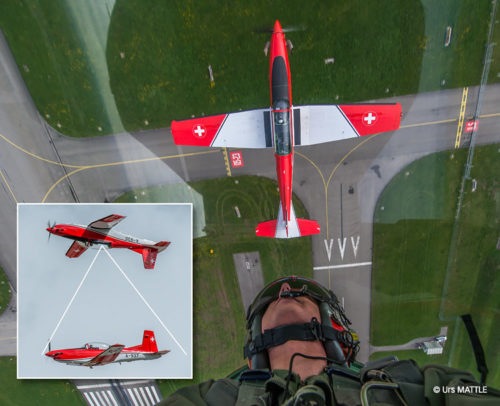Formation «Diamond» – Auf Überflügen steht das Reserveflugzeug als Fotoflugzeug zur Verfügung. Um die PC-7 Team Standardformation senkrecht von oben zu fotografieren muss der «Fotopilot» die PC-7 in einer Fassrolle (eine Flugfigur, bei der das Flugzeug eine Schraubenlinie in horizontaler Richtung fliegt) zum richtigen Zeitpunkt im Rückenflug direkt über den Verband steuern. Zum Fotografieren bleiben nur ein paar Sekunden. «Air-to-Air» Fotografie ist immer Teamarbeit zwischen Piloten und Fotograf