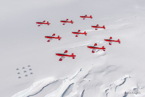 Formation «Diamond» – Aus dem Fotoflugzeug von schräg oben über dem frisch verschneiten Aletschgletscher fotografiert.