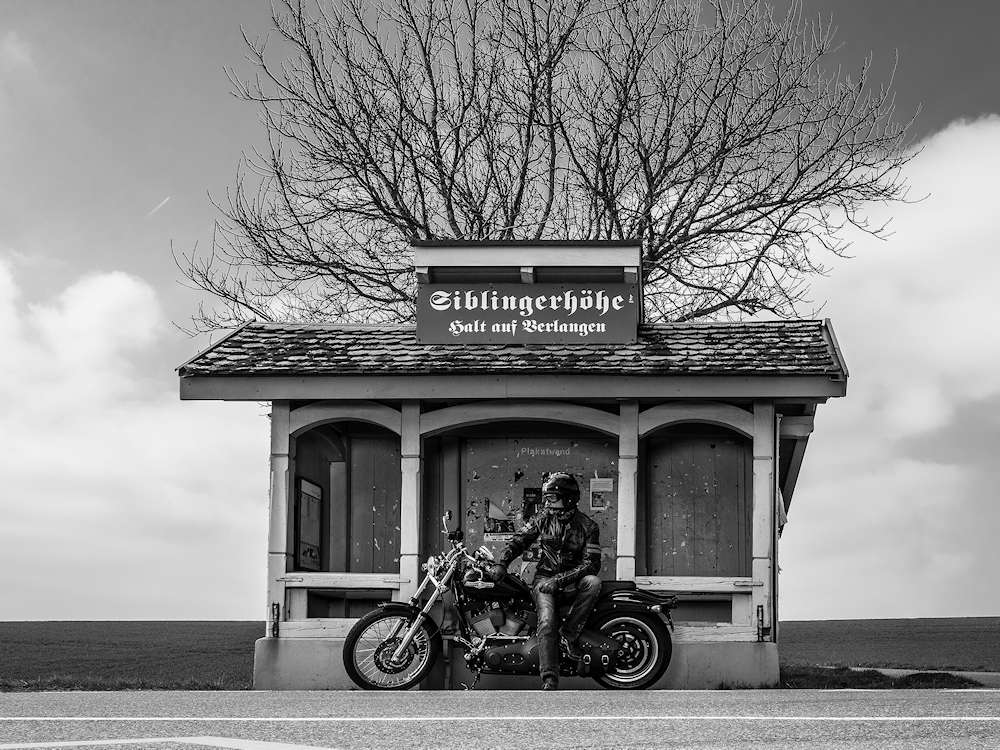 «Marco mit Bushäuschen». Aufnahme: Panasonic GH5, mit dem Leica Lumix DG Elmarit 2.8–4.0/12–60mm ASPH O.I.S auf 20 mm // 1/200 sec. // f 10 // 200 ISO // vorhandenes Licht plus Aufhellblitz // ohne Stativ. Postproduktion: Leichtes Nachschärfen // sw-Umwandlung in Lightroom