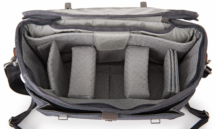 Der Schultertragegurt verfügt über eine extra lange mit Neopren gepolsterte Schulterauflage, die von der Länge auch ausreicht, um die Tasche diagonal zu tragen. Im Hauptfach finden sich abgesteppte variable Velex-Teiler mit geschlossen-porigem Schaum für die Anwender-spezifische Einteilung der Tasche. Zusätzliche kurze Teiler erlauben das «übereinander Stapeln» kleinerer Objektive. Alle Teiler und die Bodenpolsterung können komplett entfernt werden, um die Tasche platzsparend im Reisegepäck unterbringen zu können.