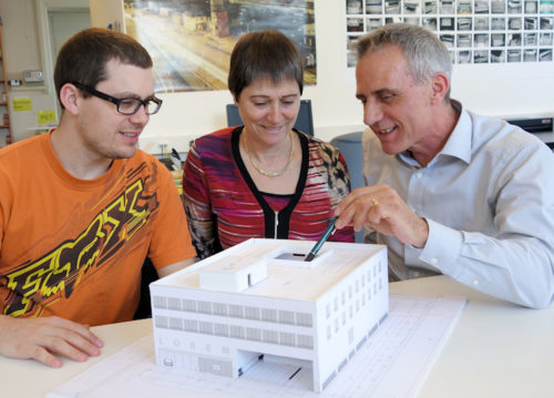 Die Familie Losenegger bespricht den neuen Demo- und Schulungs-Raum am Modell ihres Neubaus, der im Oktober 2017 bezugsbereit sein wird.