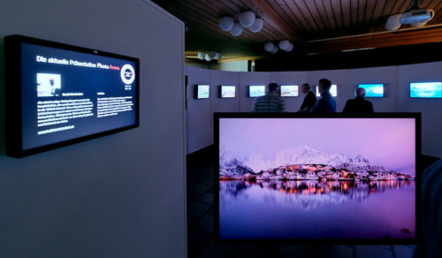 Im Obergeschoss des Kirchgemeindehaus ist die Photo Arena angesiedelt, eine Bilderschau von zehn Fotografen zu Naturthemen, die jeweils drei Minuten dauern. Ein Ort zum Stehenbleiben und Geniessen … (Kirchgemeindehaus [3])