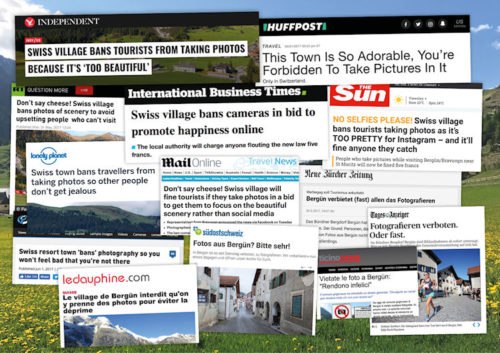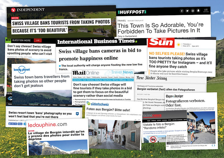 Ein idyllisches Bergdorf mit charmanten Engadiner Häusern, grasenden Kühen auf grünen Wiesen und viele schneebedeckte Berggipfel so weit das Auge reicht. So sieht es in Bergün aus. Und das wissen mittlerweile viele Menschen. «Die Schönheit unseres Dorfes ist nun weltberühmt», sagt der Bergüner Gemeindepräsident Peter Nicolay. «Millionen von Menschen rund um den Globus kennen Bergün jetzt.» Diese Popularität verdanken die Bergünerinnen und Bergüner einer aussergewöhnlichen Aktion. Sie haben am 29. Mai 2017 per Abstimmung ein «herzliches Fotografierverbot» eingeführt. Warum? Es ist wissenschaftlich erwiesen, dass schöne Ferienfotos auf Social Media die Betrachter unglücklich machen, weil sie selbst gerade nicht vor Ort sein können. Dem wollte die Bergüner Bevölkerung entgegenwirken und gleichzeitig ihr Dorf touristisch bekannter machen.