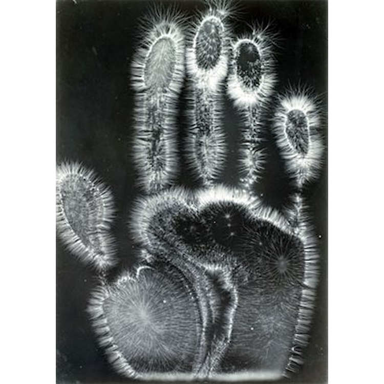 Die Hand ruht auf einer fotografischen Platte, welche die von ihr ausgehenden Strahlungen aufzeichnet. Jacob von Narkiewicz-Jodko hat diese Elektrofotografie 1896 gemacht. Dem zeitgenössischen Publikum erschien sie magisch und unergründlich.