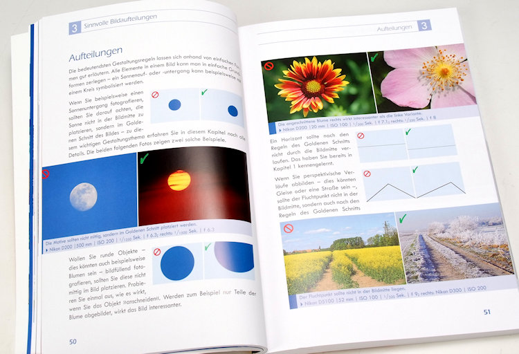 Gradias geht zunächst auf die Grundlagen der Bildgestaltung, auf die bestimmenden Faktoren, ein. Danach geht das Buch in die Tiefe und befasst sich mit der Bildraumaufteilung, mit der Schärfe und Schärfentiefe, mit dem Kamerastandort, mit Motivformen und letztlich mit den verschiedenen Lichtarten und den Farben, die ebenfalls bestimmend sind für eine perfekte Bildgestaltung. Die Themen werden sehr ausführlich und mit eigenen Erfahrungen des Autors beschrieben und abgehandelt. Da und dort sorgen Grafiken und Kästchen mit Tipps für ein besseres Verständnis. Unzählige eigene Bildbeispiele belegen die Aussagen und wirken auf den Leser als leicht nachvollziehbar.