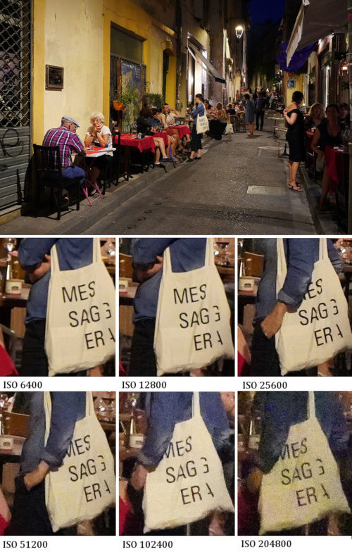 Ich bin spät abends zum Place du Forum gegangen und habe dort mit den hohen Empfindlichkeiten in eine belebte Seitengasse fotografiert. Das Resultat: bis ISO 6400 ist das Ergebnis sehr gut. Bei ISO 12800: gut. ISO 25600: akzeptabel. ISO 51200: noch brauchbar. ISO 102400: wenn es sein muss. ISO 204800: besser als gar kein Bild. Auf jeden Fall übertrifft das Ergebnis alle Erwartungen. Wenn ich da an die analoge Zeit zurückdenke, wo wir mit warmen Entwickler gerade mal bis ASA 3200 unsere Griesssuppe kochten … Wer braucht sie denn, diese ISO 204800? Wahrscheinlich niemand. Aber das Ergebnis zeigt, dass die Entwicklung neuer Sensoren (und der entsprechenden Software!) noch lange nicht am Ende ist.