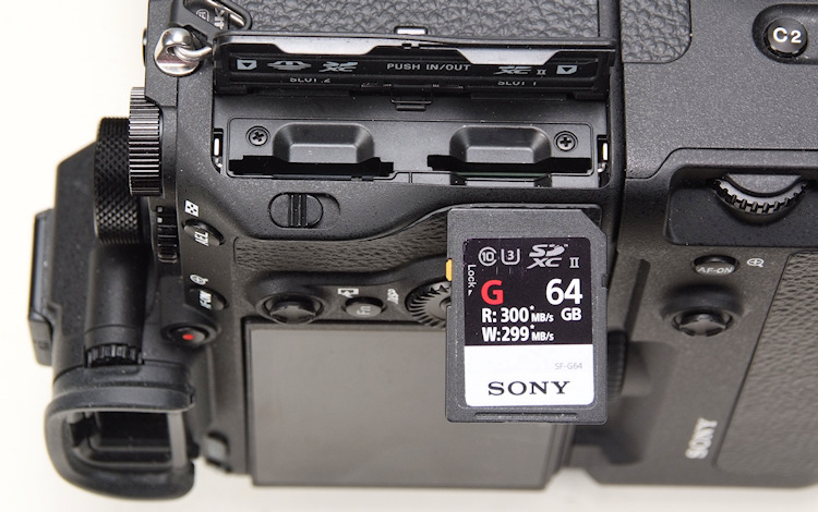 Die Sony a9 ist mit zwei Speicherkartenslots für SD-Cards (UHS I und II) und Memory Stick PRO Duo (in Steckplatz 2) ausgestattet, die verschieden konfiguriert (RAW/JPEG, RAW+JPEG, Backup, Video) werden können. Wir haben in der a9 die superschnelle SDXC II 64 GB praktisch genutzt und eigentlich nicht getestet, weil man mit der a9 auch im 20 Bildermodus oder mit 4K-Video kaum an deren Grenzen von 300 Mbit/s Lese- und Schreibgeschwindigkeit kommt. Die Karte gehört zu den derzeit schnellsten des Marktes und ist bereits für die nächste Kamerageneration gewappnet.