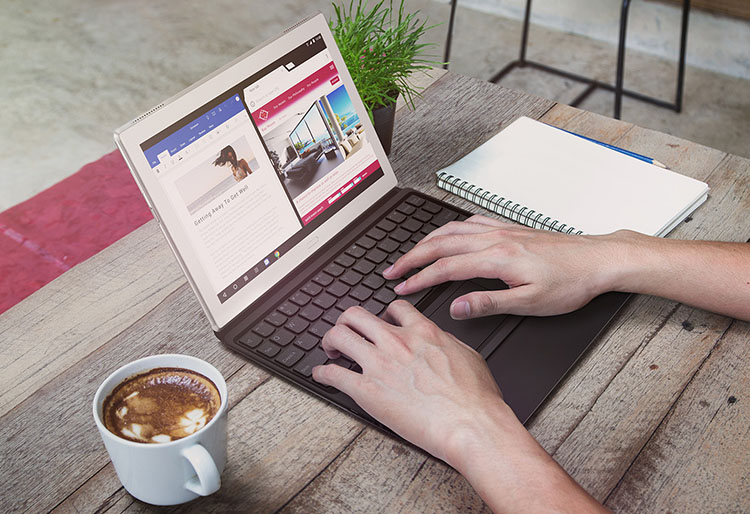 Lenovo Tab 4 10 Plus mit dem Productivity Pack, das eine Bluetooth-Tastatur sowie eine softwaremässige Taskleiste bietet.