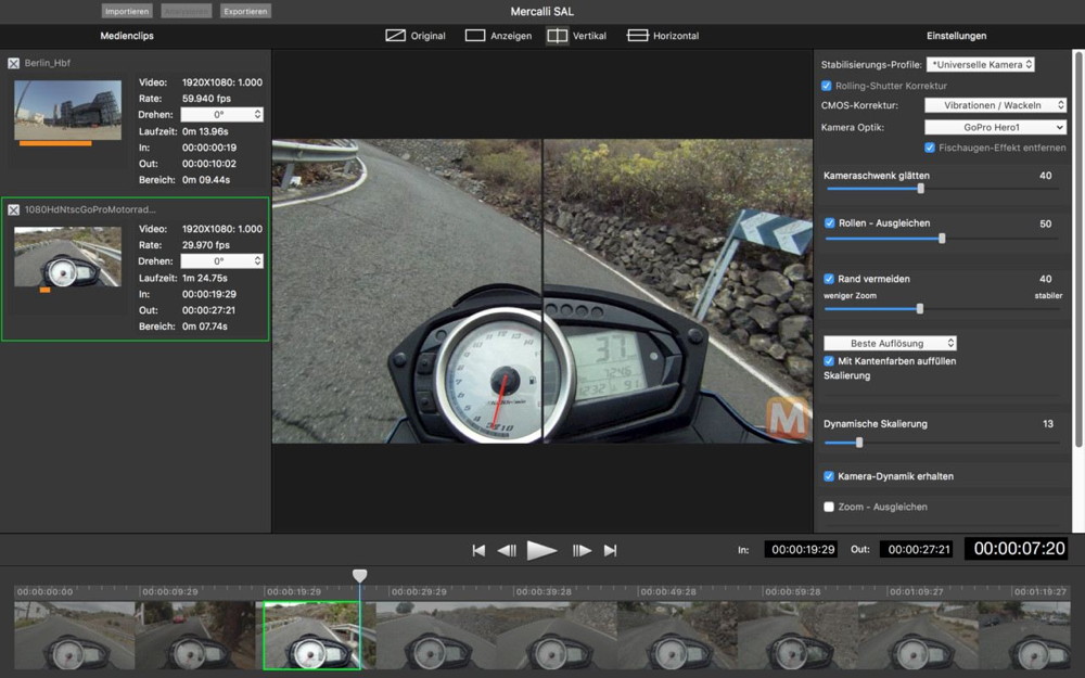 Mercalli bietet eine Echtzeit-Vorschau von originalem und korrigiertem Footage in wahlweise vertikal oder horizontal geteilter Vergleichsansicht.