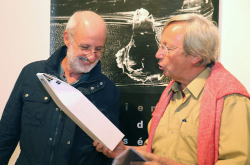 Während der Zeremonie wurde Dozent Franco Mattei (links) von Marco Garbani (rechts) für sein grosses Engagement geehrt, das er seit mehr als 30 Jahren in die Ausbildung junger Menschen im Bereich der Fotografie steckt