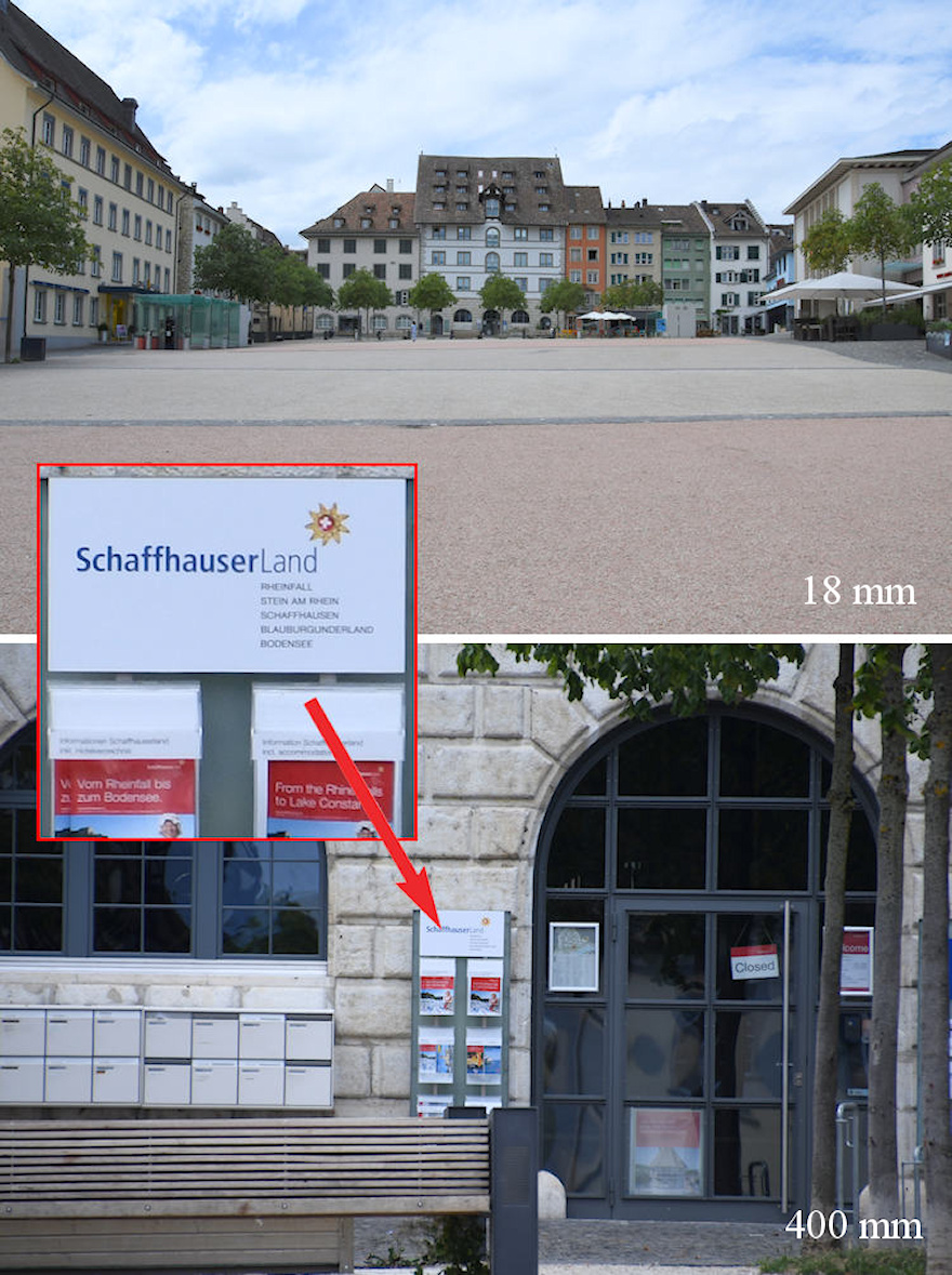 Der «Herrenacker» in Schaffhausen. Aus knapp 100 Meter Entfernung ist die Schrifttafel in der 400 mm-Aufnahme noch lesbar