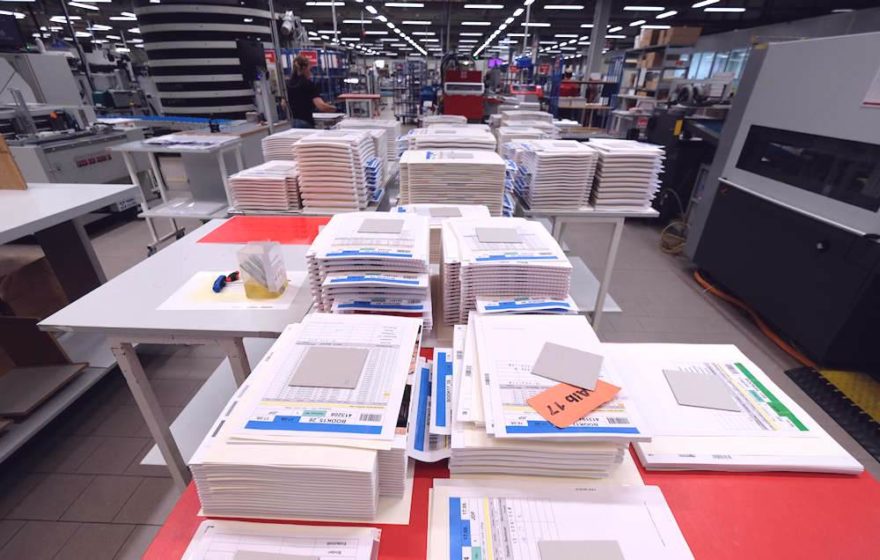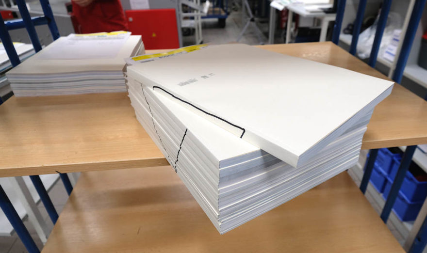 Die doppelseitig bedruckten Bögen liegen zur Weiterverarbeitung in der Buchbinderei bereit. Jeder Bogen weist im Randbereich den Auftragscode auf, so dass Verwechslungen im weitgehend automatisierten Prozess praktisch ausgeschlossen sind.