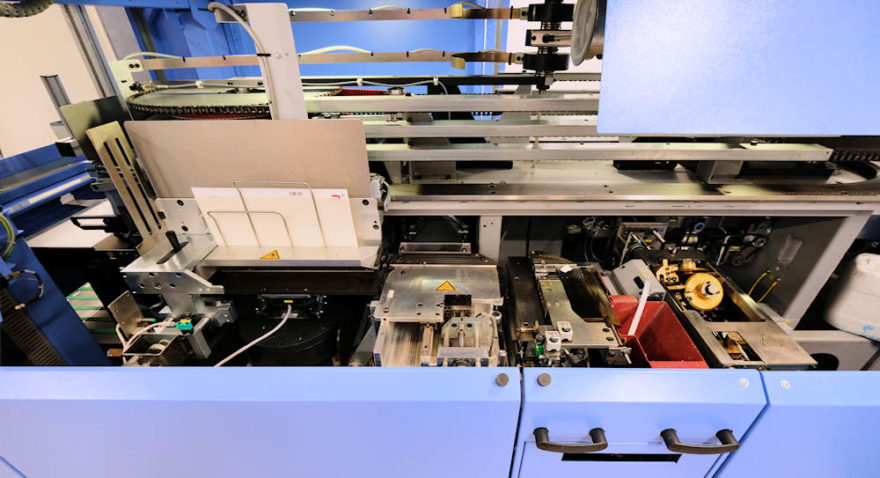 Beim Einhängen werden die Buchblocks (rechts in der Maschine) mit den Umschlägen (links) «verheiratet» – vorausgesetzt, die Strichcodes stimmen überein. Es ist der letzte automatisierte Schritt der Fotobuchproduktion.