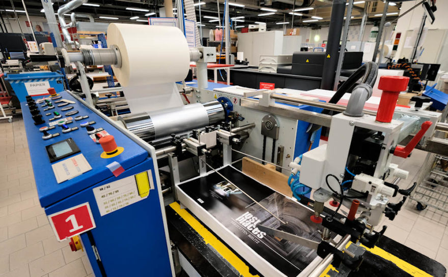 Hier wird der Umschlagbogen laminiert, das heisst mit einer Kunststofffolie beschichtet …