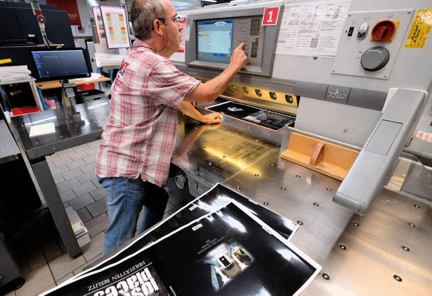 Hier werden die Bögen rückseitig gefräst, damit der Leim besser ins Papier eindringt, und danach geleimt. Man spricht von einer «Klebebindung». Nach dem Vareo Klebebinder wandern die geleimten Seiten dann zum Auskühlen durch eine Trockenstrasse und werden anschliessend mit einem 3-Seiten-Schneider akkurat zugeschnitten.